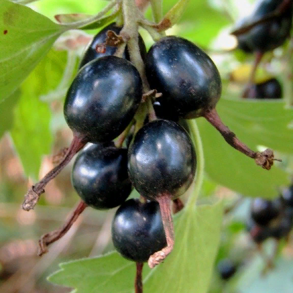 Ягоды чёрные, большие (3 гр.), овальной формы. На вкус ягоды приятные, что-то между чёрной смородиной и крыжовником. Ягоды содержат в 2 раза больше витамина С, чем чёрная смородина.